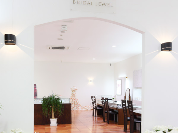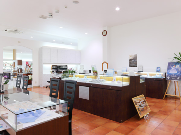 - 140坪の広い店内にゆっくりと落ち着いてリングが見れるブライダルコーナーがあります。